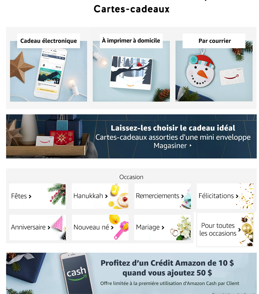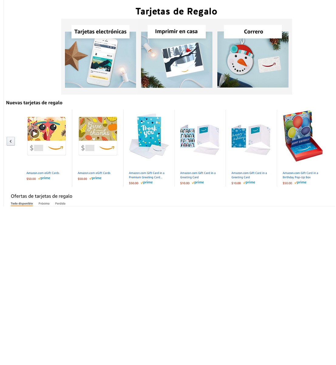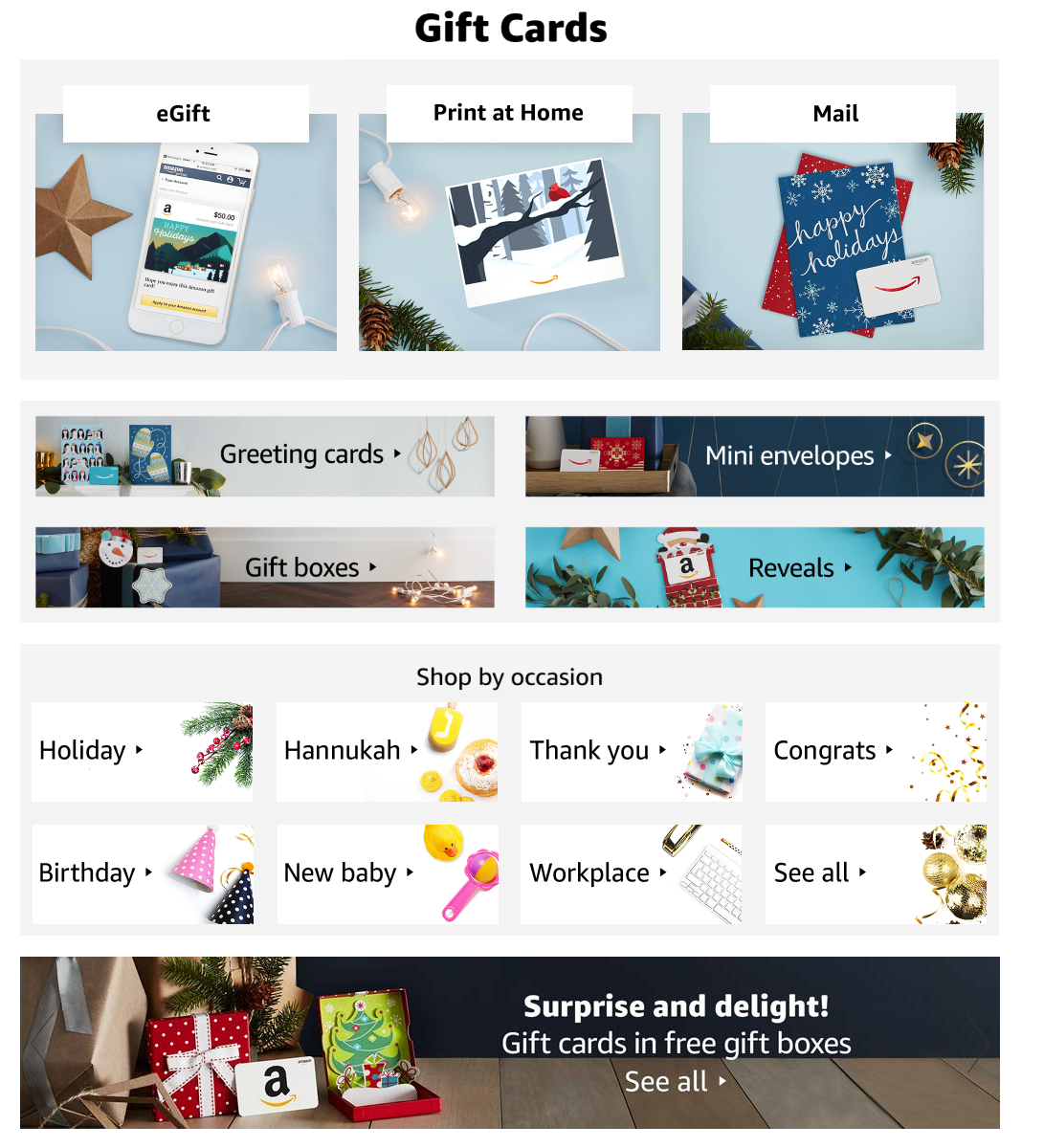 Site Merchandiser for Amazon Gift Card. Online shopping site that showcases gift cards.  Samples of various gift card campaigns for US, Spanish & French-Canada.